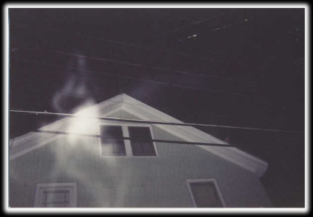 | This photograph was taken in Northampton. MA. in 1999. Rocky was a rottweiller-shephard mix that was a beloved member of our family and had a wonderful smile! Many of us wonder and do hope that our animals live on in a state of sublime happiness when they leave us. I referred to Rocky as my 'angel'. Notice the white luminescent wing and the big smile on his face? And there is more in this picture as someone stands at the window looking out at us. |